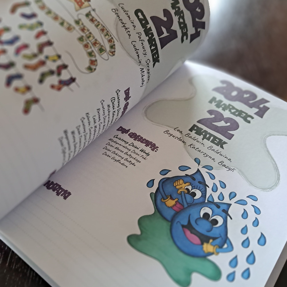 Każde z umieszczonych w naszym kalendarzu święto zostało sprawdzone, poznaliśmy i zweryfikowaliśmy jego genezę oraz inicjatorów. Świątecznikowe karty z kalendarza zawierają również informacje o oryginalnych i mniej spotykanych imieninach, obok tych najbardziej popularnych. Wszystko to wzbogacone zostało o autorskie, ręcznie rysowane ilustracje, będące najmocniejszą stroną ŚWIĄTECZNIKA.